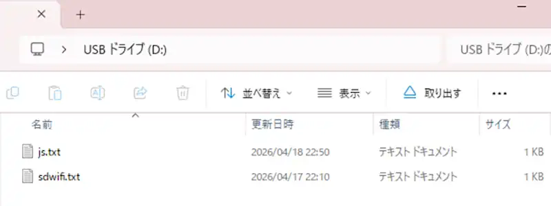 最初にSDカードに「sdwifi.txt」、「js.txt」のファイルを作成します。ファイルはソースコード全体のものをテキストファイルで保存しています。