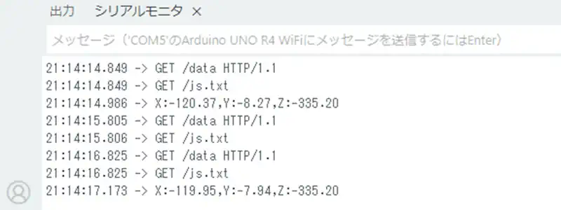 その後、JavaScriptの処理によって一定周期でGET /dataが送信され、UNOR4-WiFiはセンサーのデータをJSON形式で応答します。