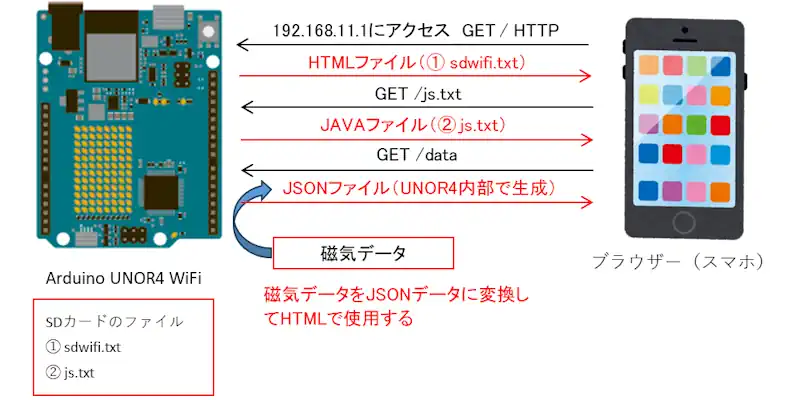 Arduino UNO R4 WiFiのWiFiライブラリとSDライブラリを使用するとSDカードに保存したHTMLファイルで応答するWebServerを実装することができます。地磁気センサーのデータをブラウザーに表示して動作確認しました。