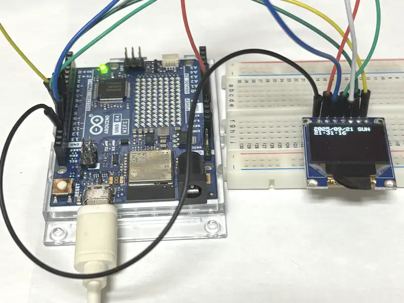Arduino UNO R4 WiFiはRA4M1マイコンをメインに搭載しているためRTCを実装することができます。RTCライブラリで時刻を取得し、OLEDライブラリ(SPIライブラリ)を使って時刻を表示して動作確認を行いました。