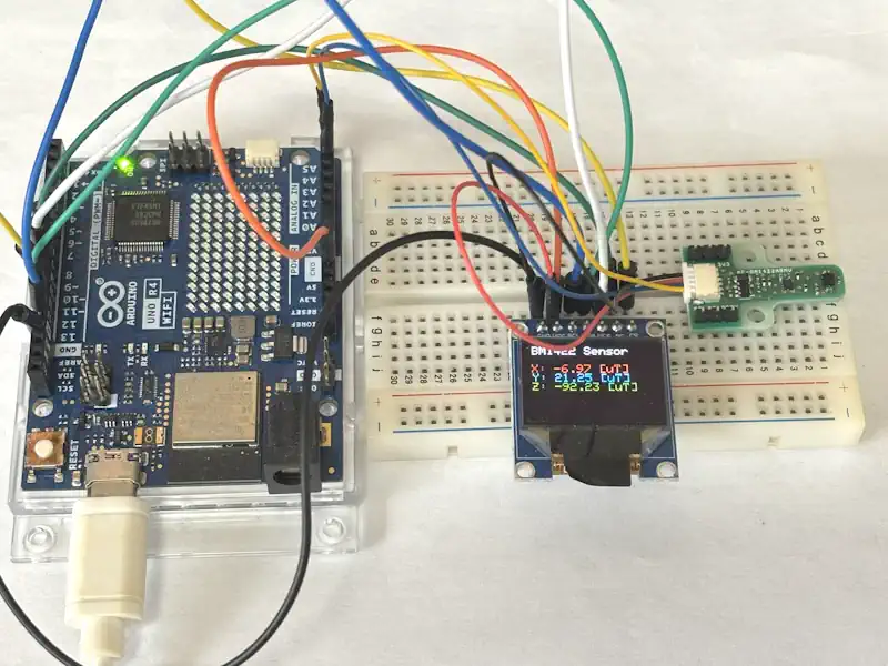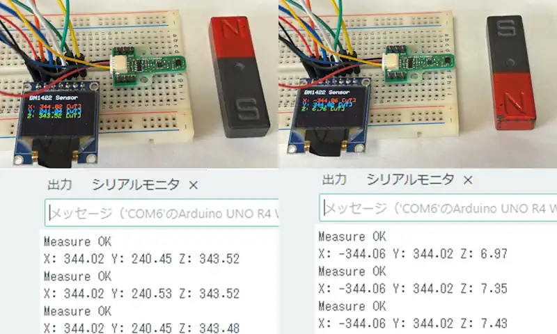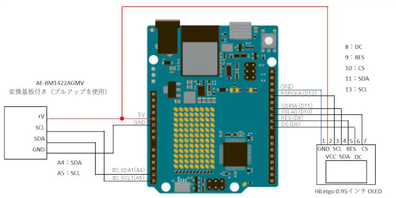 Arduino UNO R4 WiFiのWireライブラリを使用するとI2C通信に対応したセンサーからデータを取得することができます。Wireライブラリの使用例として地磁気センサーからデータを取得し、OLEDに表示して動作確認を行いました。
