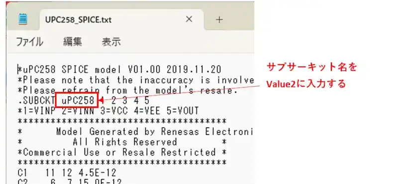 ソフトウェア/ツールタブからシミュレーションモデル内の「UPC258 Spice Model」をダウンロードして、ファイルを展開すると「UPC258_SPICE.txt」が入っています。