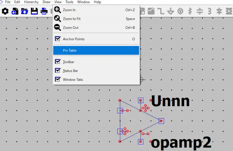 「UPC258.asy」を開いてピン設定を確認します。ピン設定はViewからPin Tableをクリックして確認します。