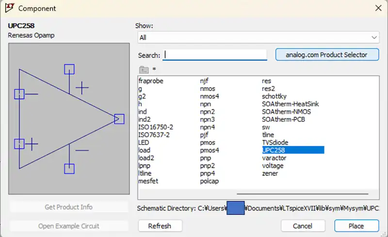 追加したuPC258のspiceデータの動作を確認します。以下はユーザーの管理するフォルダを指定して動作確認を行います。回路の作成方法は下記にまとめています。