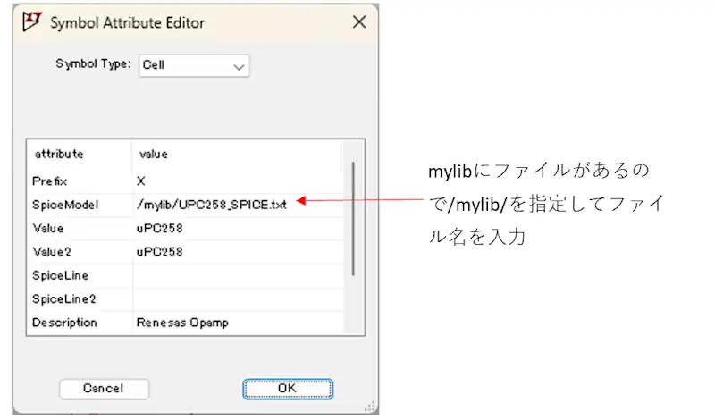 次に、spiceデータのリンク付けを行います。mylibに保存した「UPC258_SPICE.txt」を指定するため/mylib/を追加して指定します。