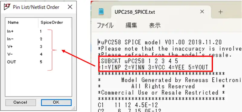 「UPC258_SPICE.txt」をメモ帳などで開くとピン情報などspiceデータの詳細が記載されています。Pin Tableを開いて表示されるPin Listとファイルのピン番号が一致しているかを確認します。