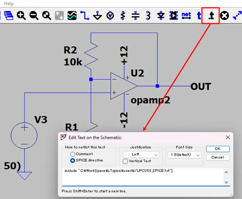 例では「.include”C:\WorkSpace\LTspice\userlib/UPC258_SPICE.txt”」を入力しています。