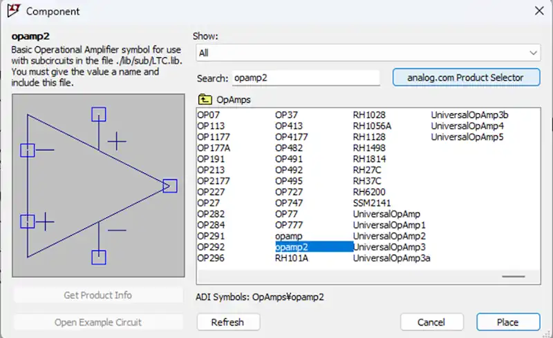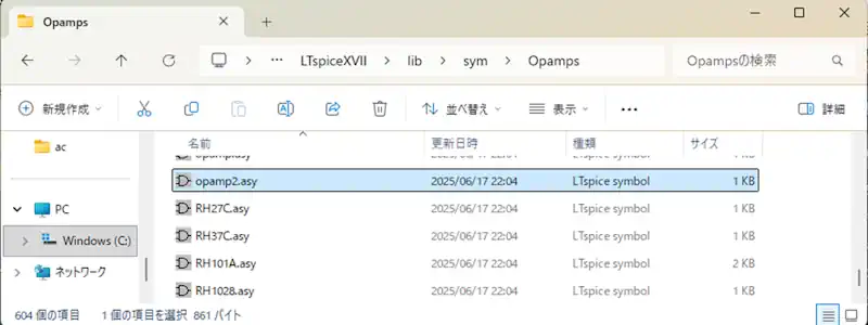 ドキュメントフォルダにあるLTspiceのフォルダから内層に下っていきOpampsフォルダ内にあるopamp2.asyのシンボルを流用するために選択して開きます。