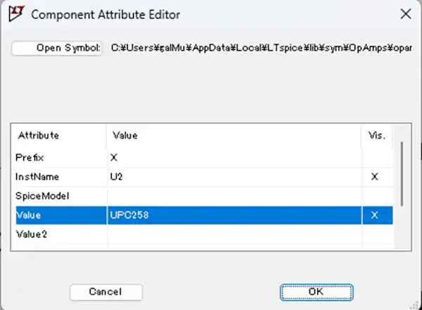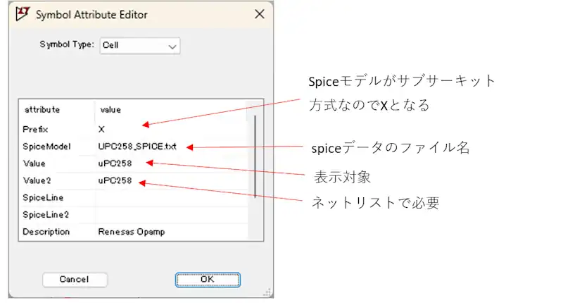 SpiceModelはspiceデータのファイルを指定します。追加した「UPC258_SPICE.txt」を入力します。