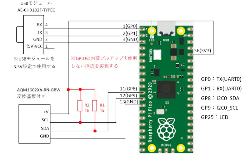 PicoのUART0をシリアルモニターで使用するためUSBモジュール(AE-CH9102F-TYPEC)を使用しています。PicoはDC3.3VのマイコンなのでUSBモジュールの出力がDC3.3Vになるようにしています。