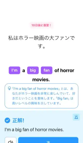 穴埋め部分をスピーク練習しながら答えたり穴埋め部分の単語を入力したりしてクイズを進めますが、難易度が上がるにつれて重要表現をライティングするクイズとなります。